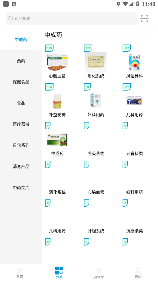 4、点击 “分类”,可按中成药、西药等类别查找药品,也能进入各专区选购。