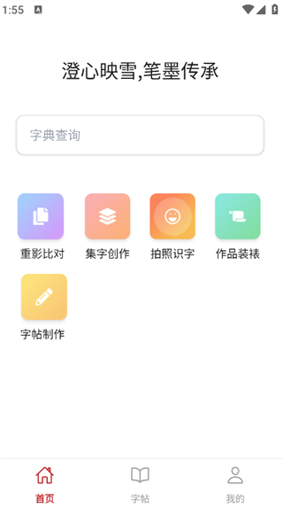 2. 在主页面即可看到重影比对、集字创作、拍照识字等功能;