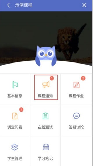 4. 发布课程通知。通过点击课程主页右上方的 “菜单”,“课程通知” 会展示该门课所发布的所有通知。