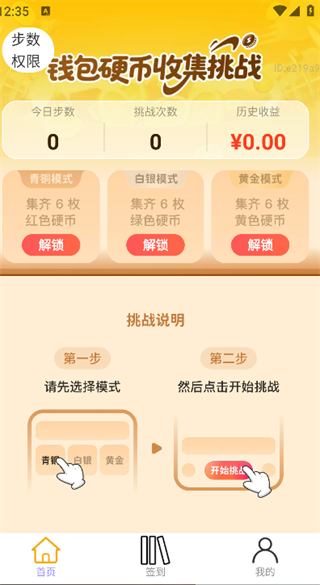 2. 在主页面即可看到钱包硬币手机挑战功能,根据挑战说明即可开始挑战;