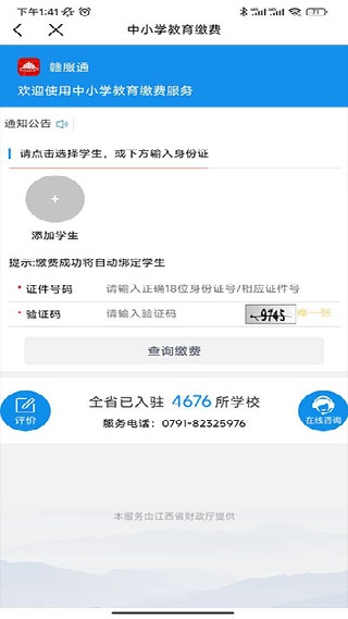 6. 点击添加学生,或在下方输入学生身份证号和验证码,随后查看缴费。