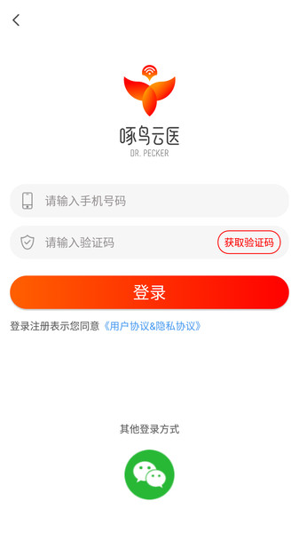1、打开啄鸟云医,输入手机号、验证码登录,也可微信登录。