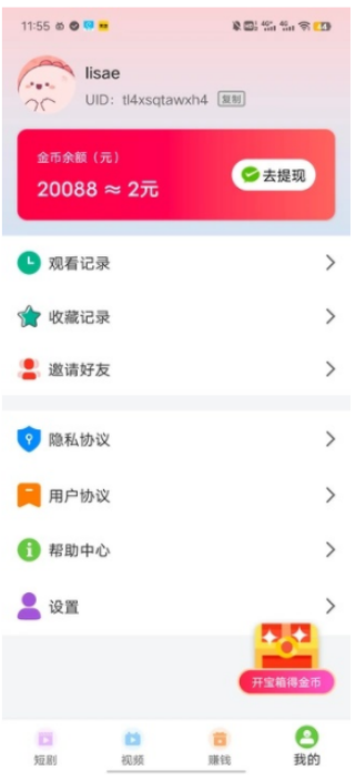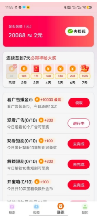 2、通过看广告、观看短剧、解锁短剧、开宝箱等任务获取金币,金币可兑换提现。