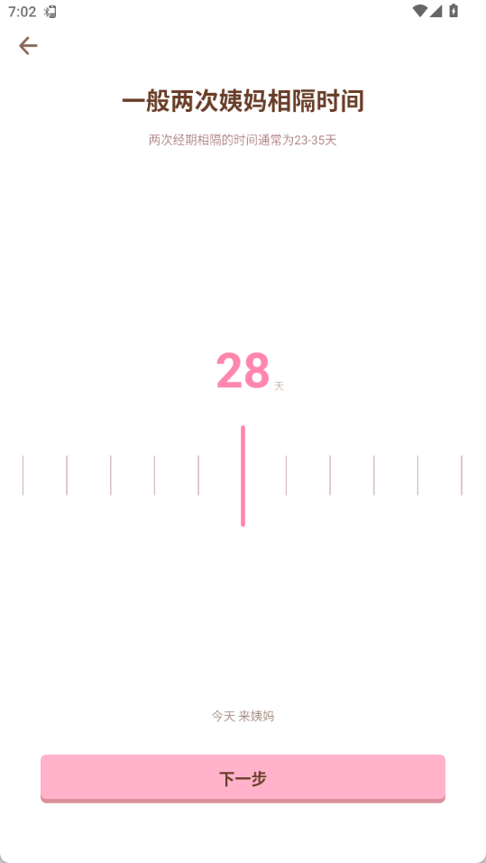 1、打开软件,先设置两次姨妈相隔时间,点击下一步。