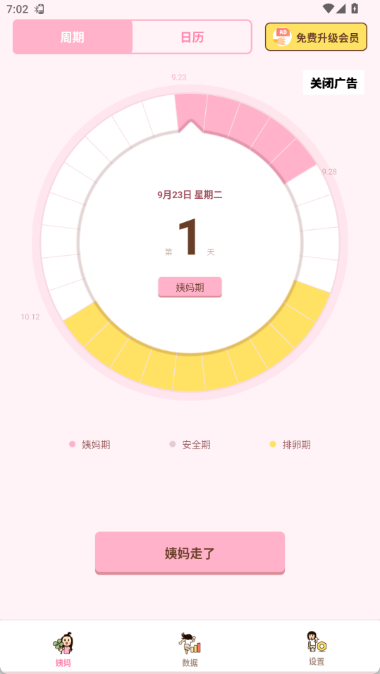 3、姨妈期间,可在周期页面查看天数,姨妈走了点击对应按钮。