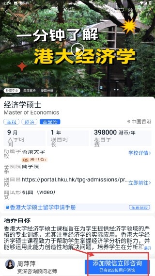 4. 在专业详情页,点击“添加微信立即咨询”按钮,即可获取留学咨询服务。
