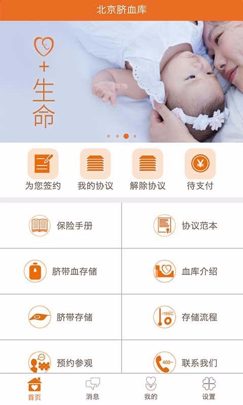 1、打开北京脐血库APP,首页可查看签约、我的协议、支付等功能。