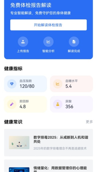 免费体检报告解读软件,是一款专注健康医疗的实用工具。它能帮咱从医院查询预约开始,一路提供健康科普、体检分析、病情解读等全方位健康服务。能迅速找到附近医院并提前预约,还能获取超多健康常识,对体检报告进行智能分析解读,了解病情相关知识,让咱更好地管理自己的健康。