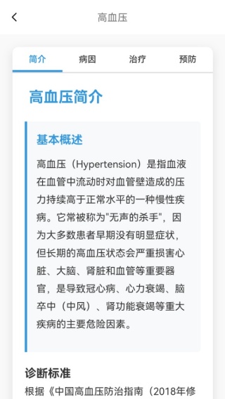 3、可以详细去查看高血压的简介内容,有病因,治疗,预防等了解。
