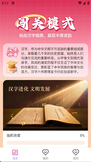 2. 在首页即可看到闯关模式和汉字科普功能;