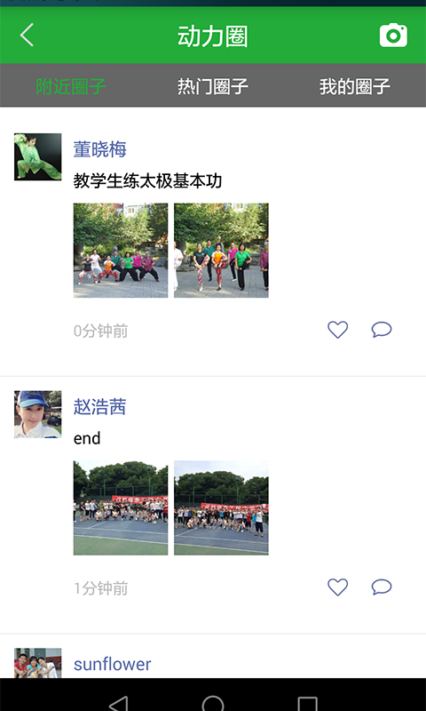 3、动力圈查看附近和热门圈子,分享运动动态,互动交流。