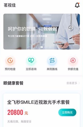 2、进入主页,可预约检查、立即咨询,购买全飞秒近视激光手术套餐。