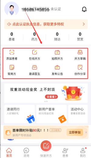2、认证执业信息,添加患者,进行在线、拍照开方等操作,管理药方。