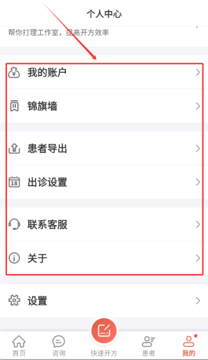3、进入个人中心,管理账户、出诊设置,联系客服,查看锦旗墙。