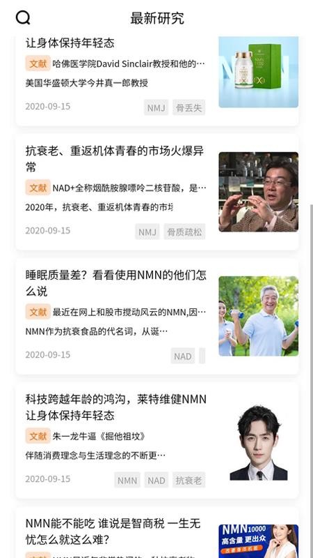 2、进入研究板块,查看最新研究文章,了解抗衰老等健康知识。