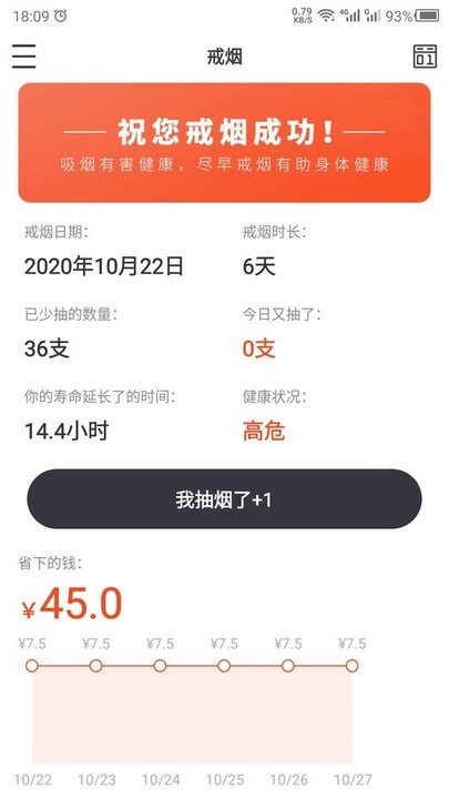 3、查看戒烟数据,了解戒烟时长、少抽香烟数量、寿命延长时间及节省的费用。