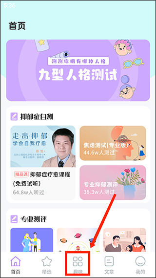 4、还可在首页参与九型人格测试、抑郁症自测等,获取专业测评和课程。