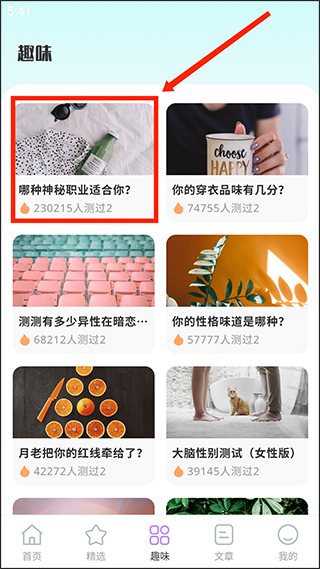 1、进入首页,点击趣味板块,选择哪种神秘职业适合你等测试,开始趣味测试。