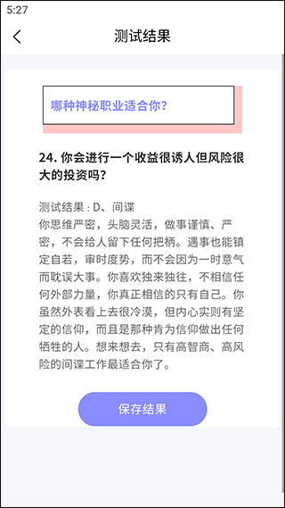 2、完成哪种神秘职业适合你的测试,查看测试结果,了解适合的职业类型,可保存结果。