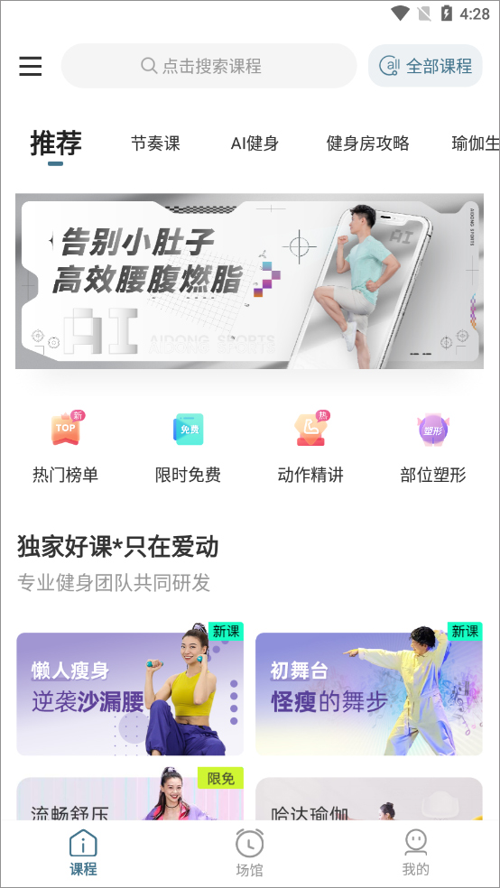 1、打开爱动健身软件,完成手机号注册登录后进入课程页面,推荐栏可直接挑选热门、免费等优质健身课程。