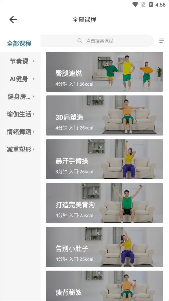 4、查看全部课程,通过搜索功能或课程分类筛选,结合自身目标找到心仪课程,跟随专业教练视频指导训练。