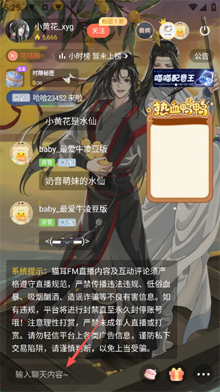 3、app会跳转到一个指定的直播间,点击屏幕左下角的聊天“信息框”。