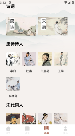 4. 点击页面下方的‘词典’,即可看到诗词页面;