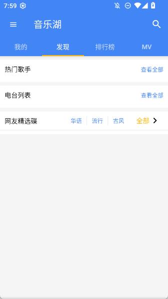 2、在首页发现模块通过歌手/排行榜等维度筛选音乐