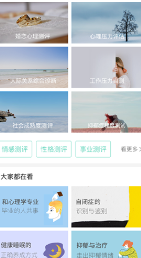 1、进入心理测评专区,选择婚恋、职场等主题测评项目,或通过"更多测评"探索其他类型;