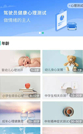 2、切换至分龄测评模块,根据婴幼儿、学生等年龄段选择对应心理评估工具;