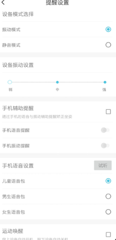 2、在提醒设置界面选择提醒模式,调整震动强度并配置手机联动提醒。