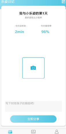 3、进入姿态日记模块,查看当日有效时长数据,可添加图文记录并分享。