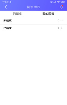 2、进入问诊中心,在问题分类标签下查看进行中/已完结问诊,切换至我的回复查看历史解答。