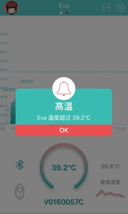 2、当收到高温预警提示时,点击确认按钮查看体温超过39.2℃的警报信息。