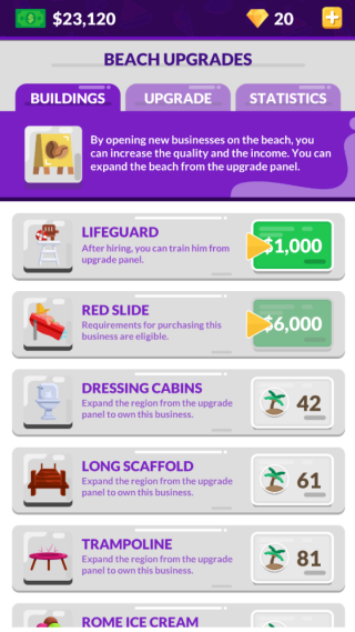 3.作品中拥有很多不同的设施能自由的建造,你要安置好每前来游玩的客人,作品中打造出了经典的经营玩法,你要在有限的海滩上建造出很多的服务,需要注意的是随着挑战的深入海滩将会吸引很多的客人前来,你要利用各种不同的消费策略满足顾客的需求,只有这样才能让你的海滩能有源源不断的收入。