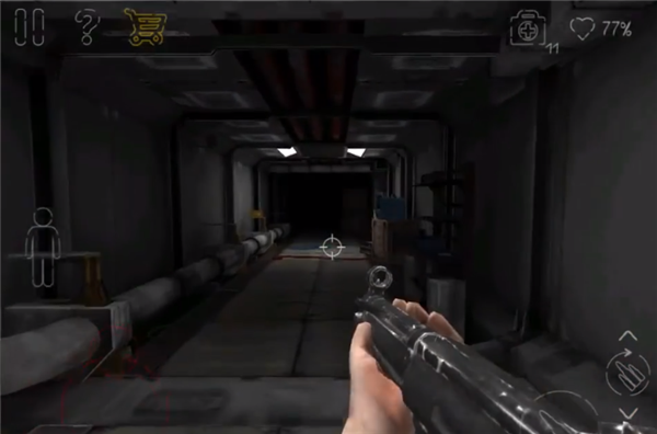 1、手持枪械在昏暗通道前进,保持警惕,缓慢移动探索。若遇敌人,瞄准后射击。
