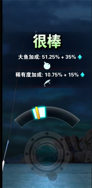 2、鱼类重量与鱼竿震动频率成正比,大鱼上钩时需要玩家快速点击屏幕完成收线操作;