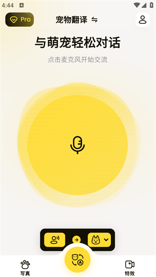 2. 在主页面即可看到宠物翻译功能,可以点击屏幕中间的麦克风图标,开始录音;