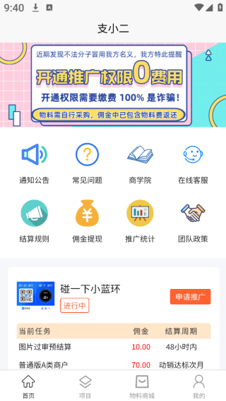 支小二app是一款专门搞“碰一下小蓝环”推广业务的软件。它有很清楚明白的数据展示,功能设计也特别高效,能让用户随时知道推广效果咋样,然后去优化推广策略。用户只要扫一下小蓝环或者点相关链接,就能很快完成推广操作。这模式简单好上手,能大大提高用户参与度和推广效率。