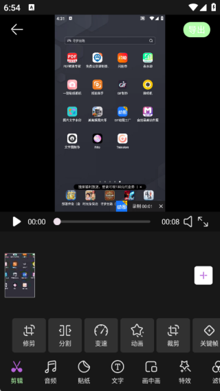 2、在视频剪辑中导入一段手机中的视频,然后进入剪辑页面中进行各种功能的操作;