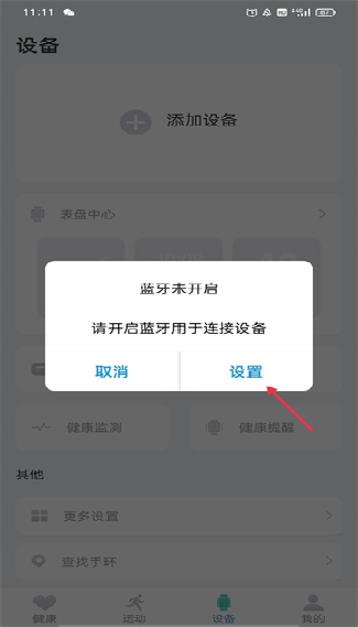 1. 在打开软件并登录账号之后,会弹出开启蓝牙连接设备的提示,点击“设置”即可。