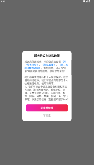 1、下载安装APP后打开软件,提示同意与否,点击同意进入注册界面;