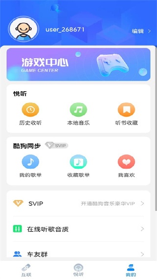 6. 最后,在“我的”板块中可看到游戏中心,以及收听历史和收藏区域。