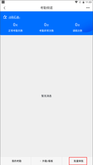 2、在这里,你会看到不同月份的考勤状况,如考勤天数、请假次数等,点击右下角的“批量审批”按钮;