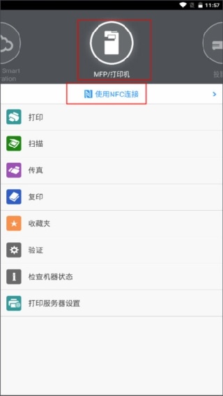 1. 打开app主界面之后,切换至【MFP/打印机】界面,点击“使用NFC连接”。
