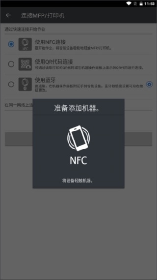 2. 连接打印机存在多种方式,以NFC连接为例,点击下方的添加机器。