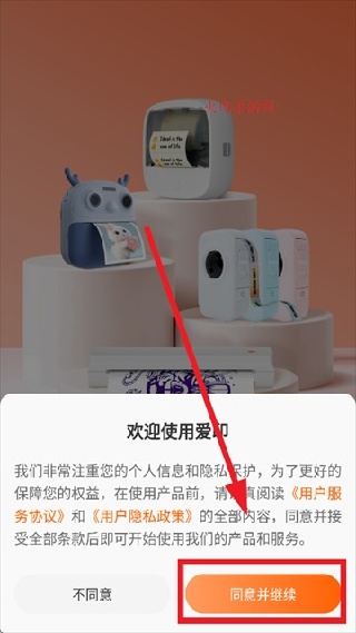 1. 下载安装并打开爱印app,在欢迎页面点击同意并继续的爱印打印机app下载途径。