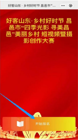 3.登录后,在首页找寻《昌邑市“四季光影 寻美昌邑”美丽乡村短视频暨摄影创作大赛作品征集》(如图),点击进入“开始报名”。