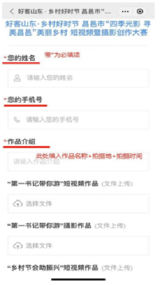 4.进入报名页面后需准确填写个人信息,以便后台准确统计你的报名信息。带*的为必填项,在作品介绍里填写“作品名称 + 拍摄地 + 拍摄时间”,然后依据所报作品类别,在下面所属栏点击“选择文件”进行上传。