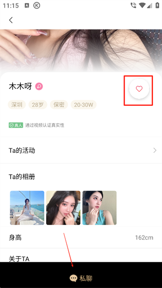 3、既可以点击爱心等待对方找自己聊天,也能够直接点击私聊。